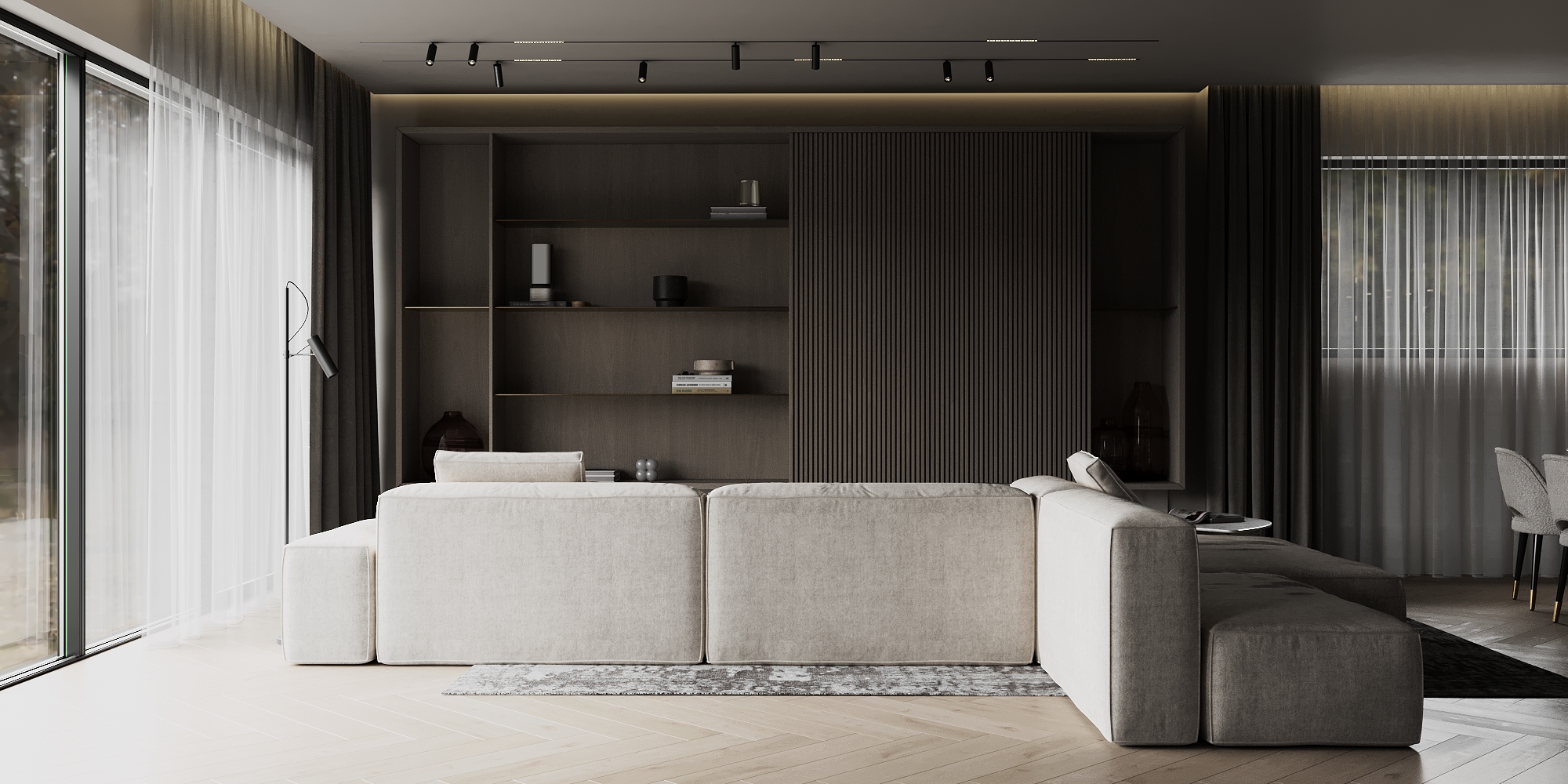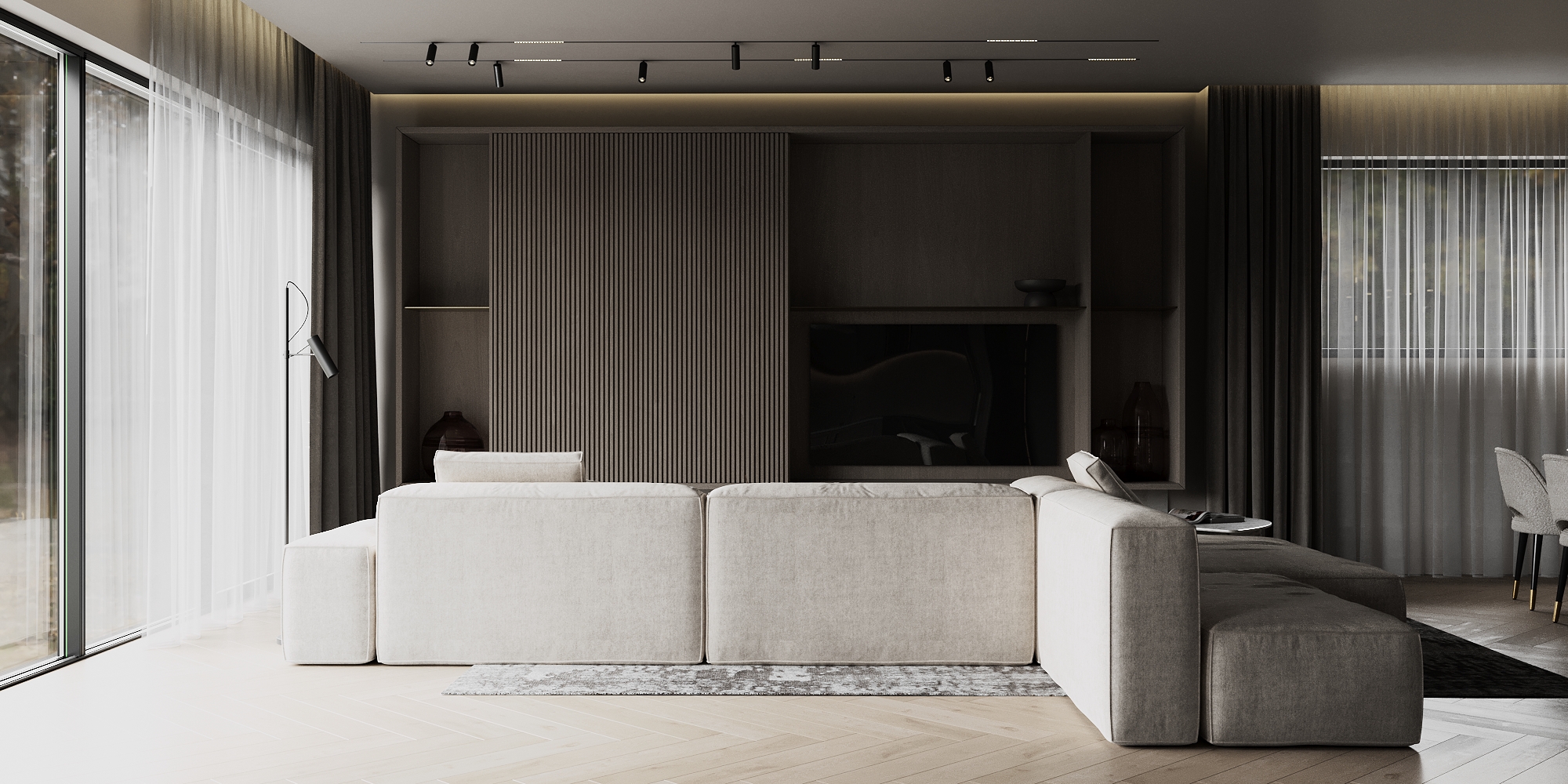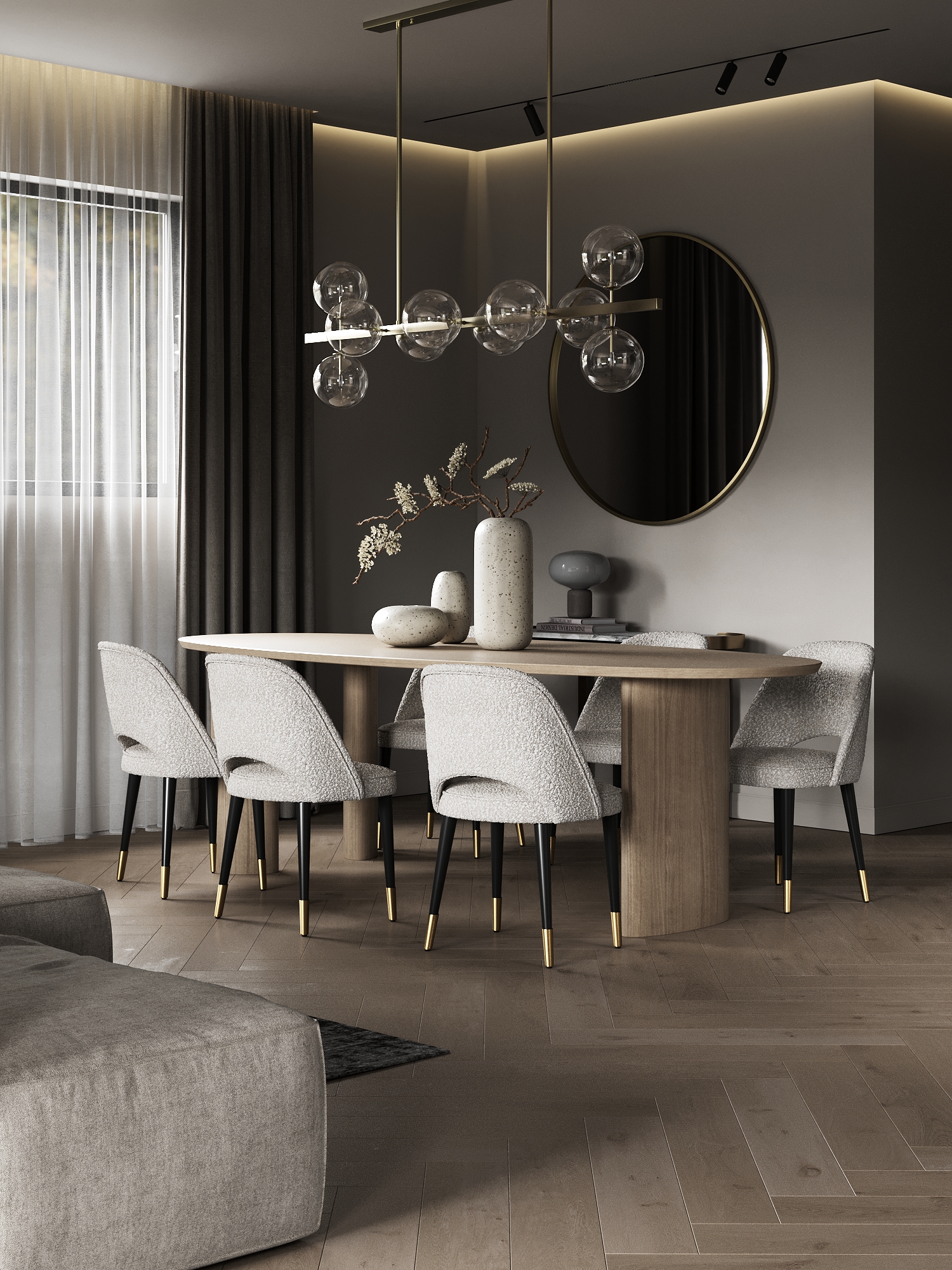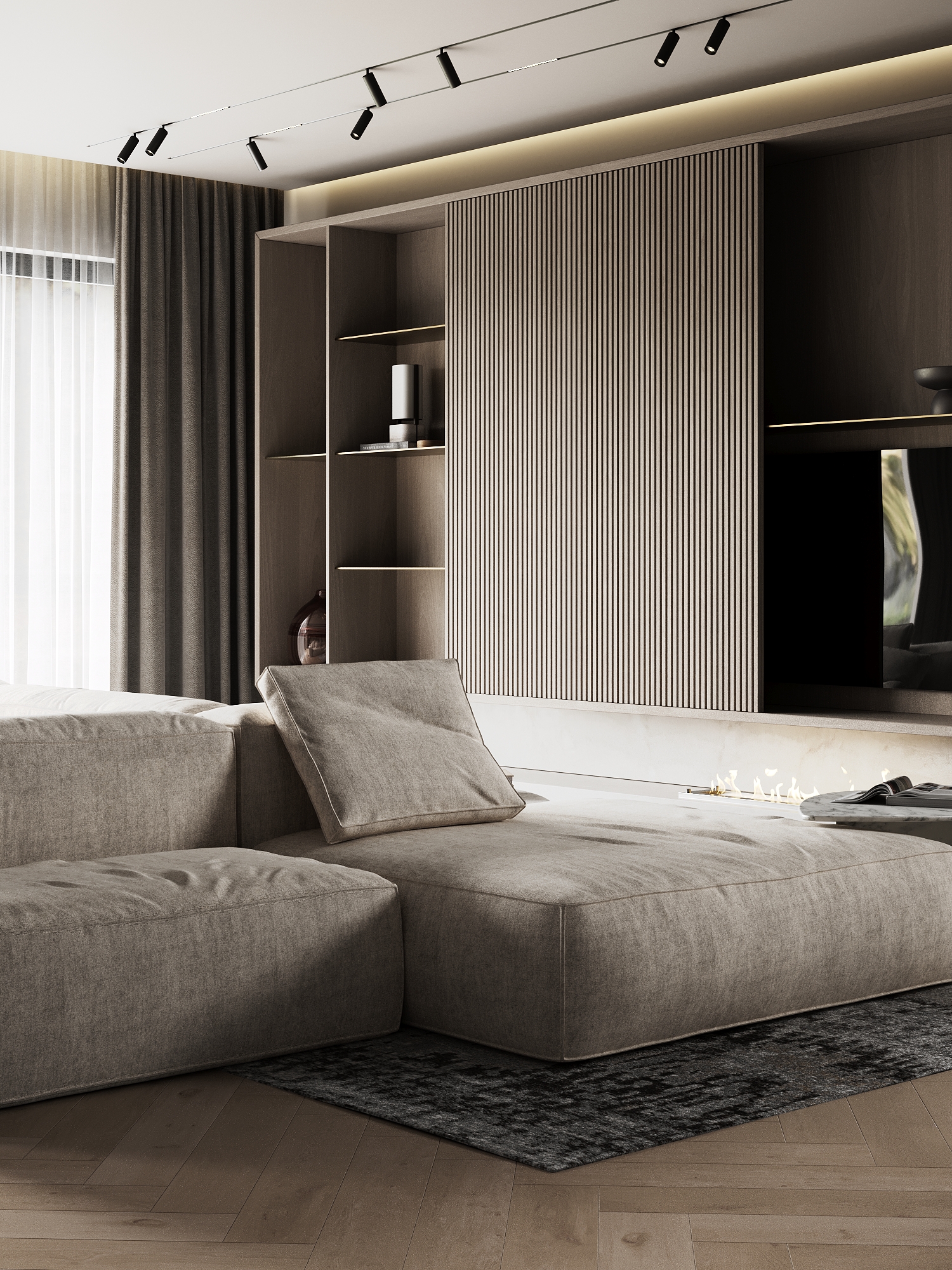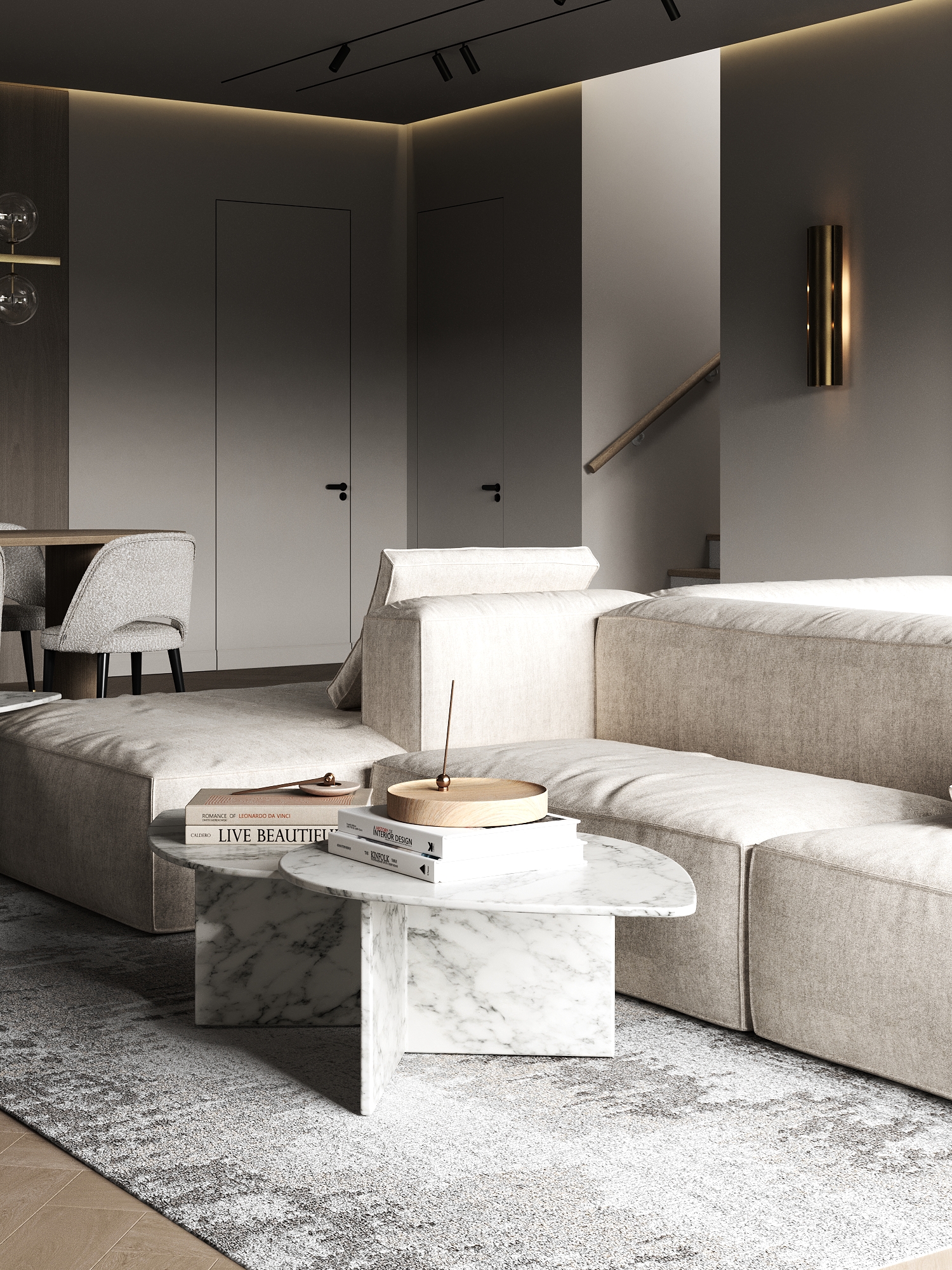 A harmonious blend of modern minimalism and warm elegance. The living room showcases sleek lines, a calming palette of beige and gold, and carefully curated lighting to enhance the ambiance. Natural materials and curated textures elevate the space, making it feel inviting yet sophisticated. – Minimalism, calming, natural.