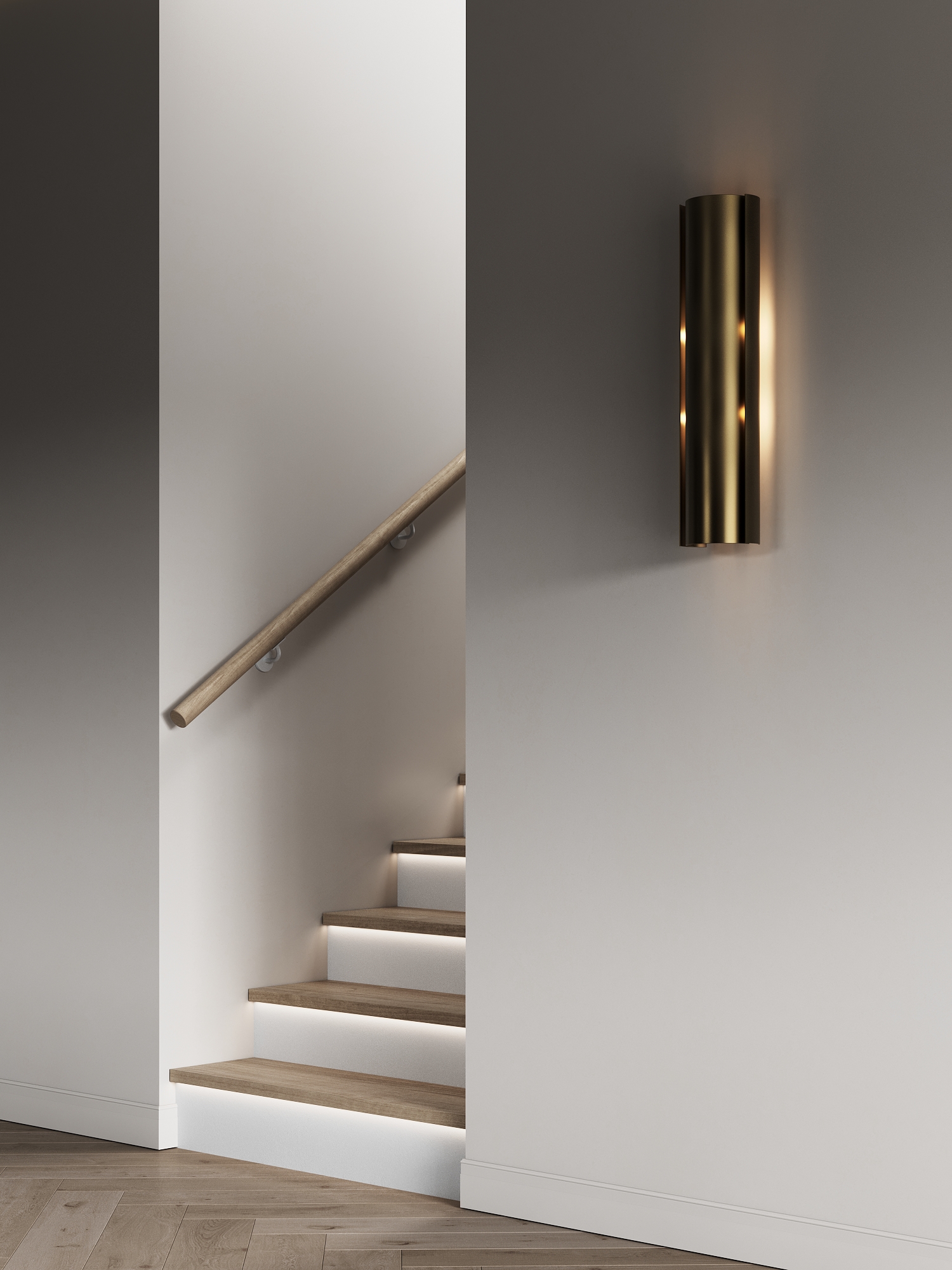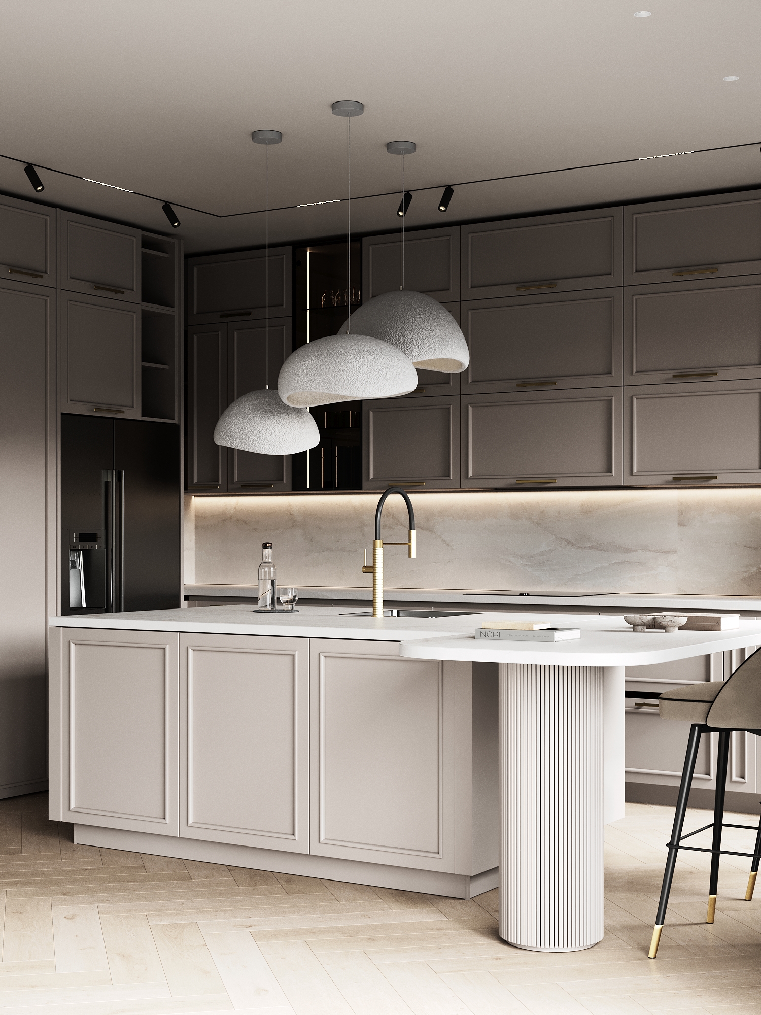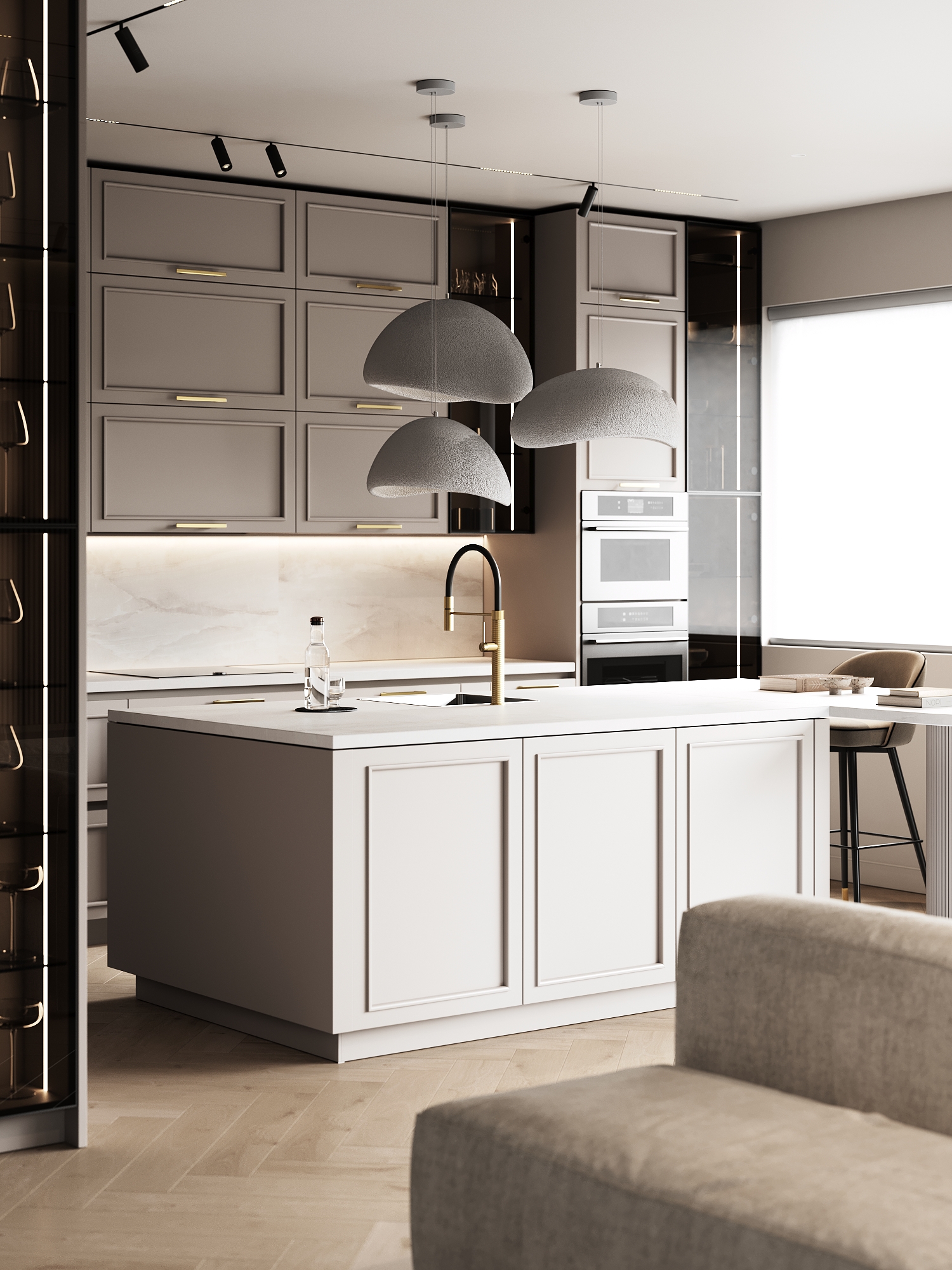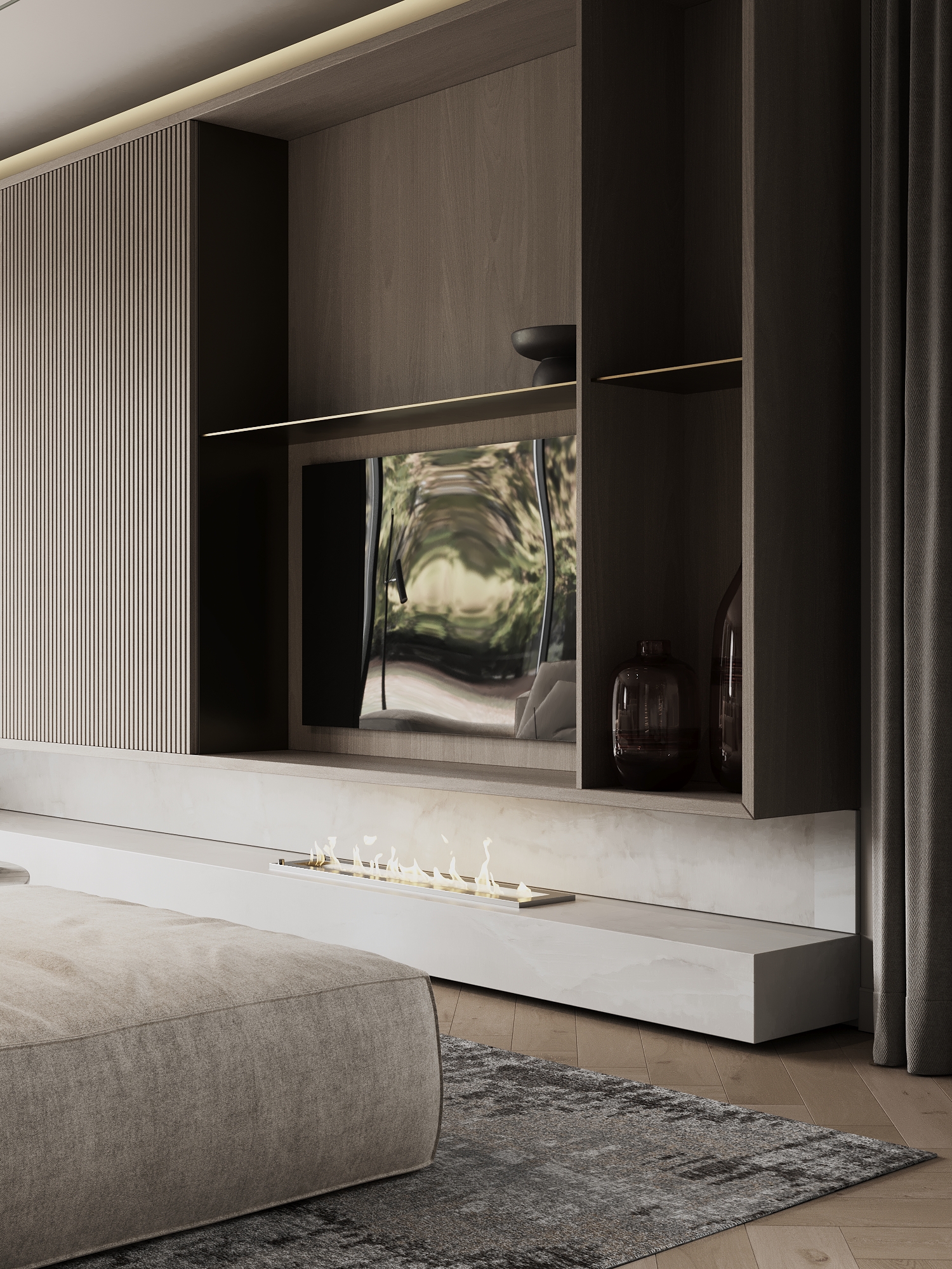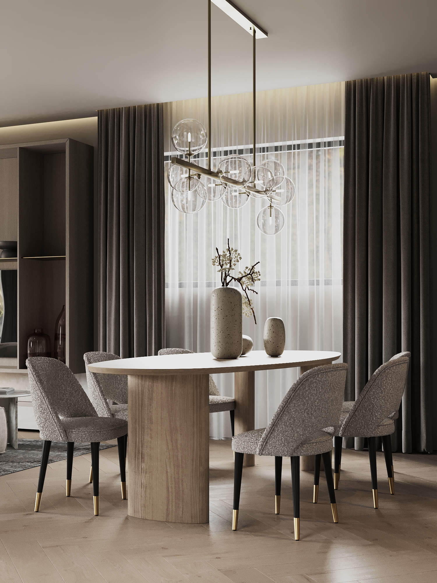 A harmonious blend of modern minimalism and warm elegance. The living room showcases sleek lines, a calming palette of beige and gold, and carefully curated lighting to enhance the ambiance. Natural materials and curated textures elevate the space, making it feel inviting yet sophisticated. – Minimalism, calming, natural.